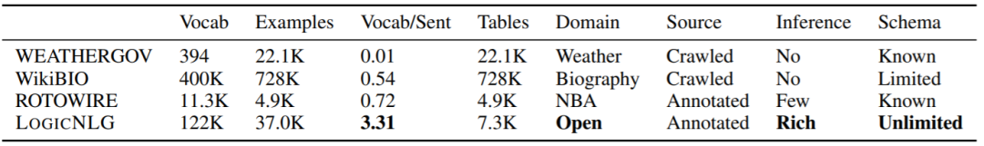 LogicNLG 数据集与已有 NLG 数据集的比较