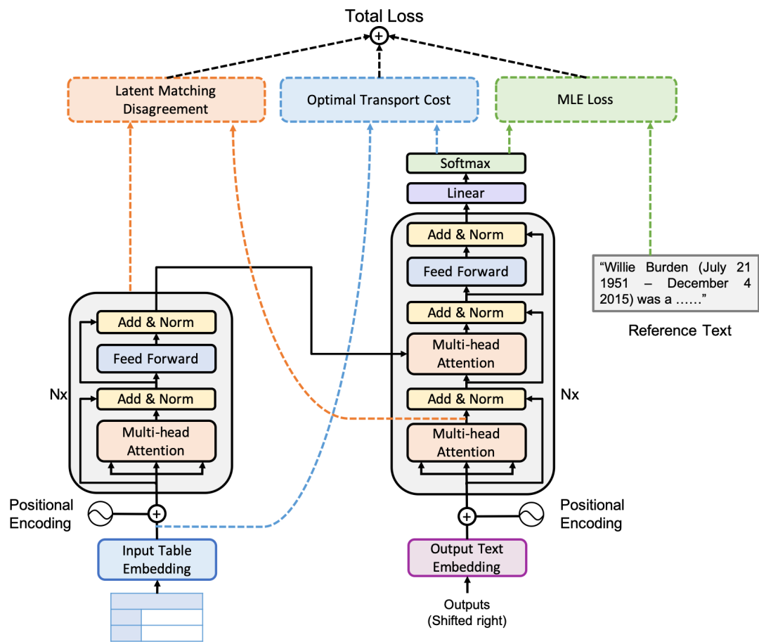 新提出的用于表格到文本生成任务的模型架构。为了生成多句式的忠实文本,其中的损失由三部分组成,包括一个最大似然损失(绿色),一个隐含匹配不一致损失(橙色)和一个最优-传输匹配损失。
