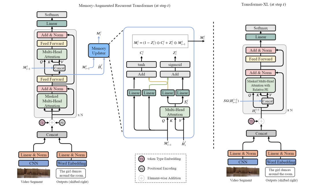 左图:用于视频段描述的记忆增强型循环Transformer