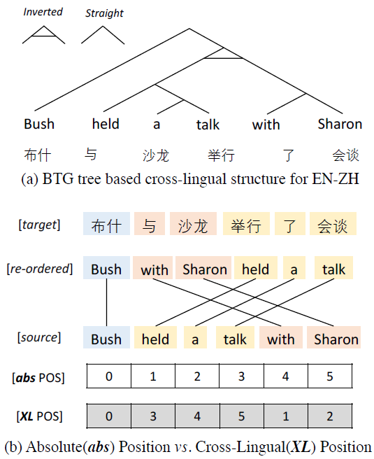 用于英中翻译任务的跨语言位置示意图。(a)展示跨语言预排序的括号转录语法(BTG)树。左上角是转录语法。(b)绝对位置编码(APE)与新提出的跨语言位置编码(XL PE)之间的差异。