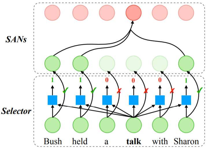 使用一个额外的选择器网络选择输入元素的一个子集的选择性自注意网络(SSAN)示意图,其中上半部分执行的自注意。这个案例中,词 talk 在输入序列上执行注意操作,而词 Bush、held 和 Sharon 则被选为真正重要的词。