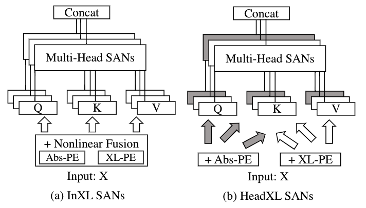 新提出的两种融合策略,其中(a)为输入层面的跨语言 SAN,(b)为头层面的跨语言 SAN