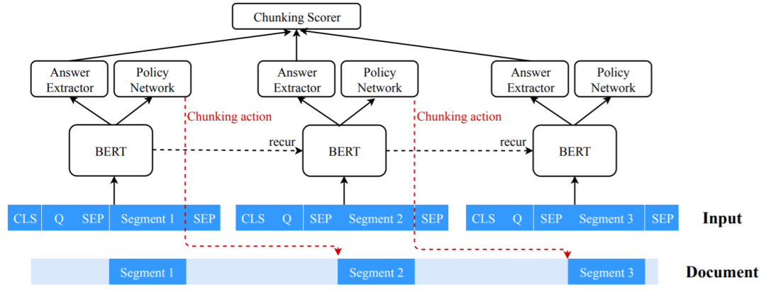本文重点讨论了对话型机器阅读理解(MRC)问题,其中模型的输入可能是冗长的文档和一系列相互关联的问题。为了处理长输入,以前的方法通常将它们分成等距段,并根据每个块独立地预测答案,而不考虑其它块的信息。结果,它们可能会形成无法覆盖完整答案或围绕问题答案所需正确答案的上下文不足的块。此外,它们的能力往往不足,无法很好地回答需要跨块信息的问题。本文提出让模型通过强化学习以更灵活的方式学习分块:模型可以确定将在任一方向处理的下一个分块。我们还应用了循环机制,以允许在块之间传输信息。我们在两个对话型 MRC 任务(CoQA和QuAC)上进行了实验,结果证明了新提出的循环式分块机制的有效性。我们可以获得的块更有可能包含完整的答案,同时能为真实的答案提供足够的上下文,以便更好地进行预测。