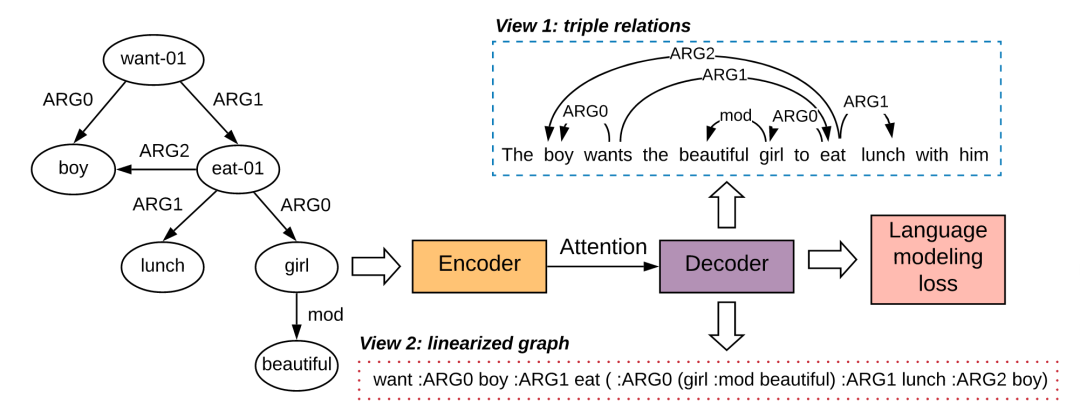 图到文本生成任务的目标是产生保留输入图所蕴含语义的句子。该任务存在一个关键缺陷:当前的模型在生成输出时,可能会弄乱甚至丢弃输入图的核心结构信息。本文提出利用更丰富的训练信号来解决此问题,这些信号可以指导我们的模型遵循输入的图结构信息。特别是,我们采用了两种类型的辅助训练信号,每种信号分别关注输入图的不同方面(也称为视图)。通过辅助信号的反向传播,以通过多任务训练更好地校准我们的模型。在两个用于图形到文本生成的基准上进行的实验表明,新提出的方法在最新的基准上是有效的。