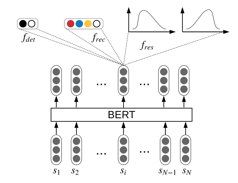 模型架构,其中使用了 BERT 来表征每个包含 N 个词的输出句子以提供共享的特征