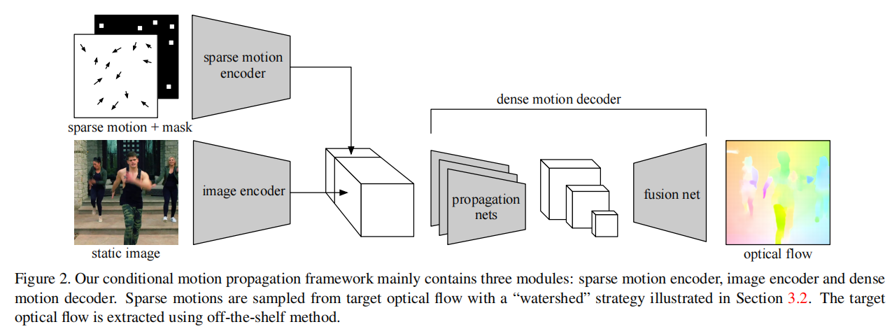CMP算法:给予图像中对象几个指导向量,算法可以给出下一步的对象运动图。(所以结合(a)optial flow prediction 阶段,通过对图像中对象的实例分割产生几个向量,就表示下一步对象的运动,然后把ground truth 和 masked image放入到CMP算法,就可以得到光流了。)