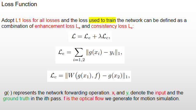 然后x2 经过U-net,得到Output,g(x2), 此时需要g(x1),g(x2)做一个时序性Loss, 然后g(x2)再和y2(y1和光流做Warping操作)做Loss。