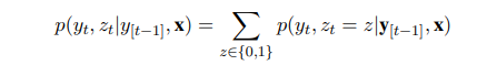 其中每个术语都以x和y [t-1]为条件。 p(yt | zt = 0)是由先前描述的S2S模型生成的分布,并且p(yt | zt = 1)是使用具有单独参数的相同注意机制计算的x上的分布。