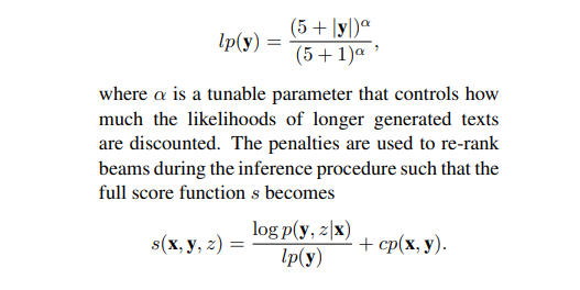 这里,β是控制罚分强度的参数。 当太多生成的单词关注相同的输入时,该惩罚项增加。 我们通常不想重复餐厅的名称或它所服务的食物类型。 因此,我们只想在实际生成餐馆名称时注意一下餐馆名称。 我们还使用Wu等人(2016)的长度惩罚lp,定义为: