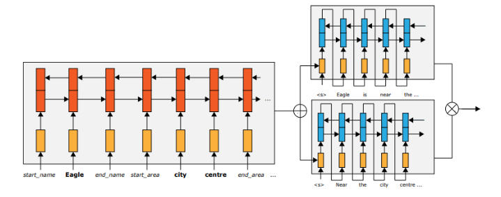 然而,Ferreira等人(2017年)表明,在小型数据集中,S2S模型的表现优于基于短语的机器翻译模型。 为了解决这个问题,Konstas等人(2017)提出了一种半监督训练方法,该方法可以利用训练集之外的英语句子来训练模型的部分。 我们通过使用复制注意来解决问题,使模型能够从源复制单词,这有助于生成词汇和稀有单词。 我们注意到,包括我们的方法在内的端到端训练模型通常不会明确地对句子规划阶段进行建模,因此不能直接与之前的句子规划工作相比较。 这尤其限制了依赖于分层结构的复杂参数结构的生成。