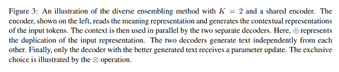 我们进一步提出了一种基于多种集成技术的训练方法(GuzmanRivera等,2012)。 在该技术中,训练多个模型以在训练模型本身的过程中划分训练数据,从而导致遵循不同的句子模板的模型的生成。我们证明了这种方法提高了生成文本的质量,但也提高了训练过程对训练数据中异常值的鲁棒性。