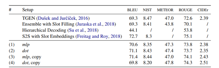 我们从具有复制机制的强S2S模型开始,并且包括可以帮助控制生成的文本的长度以及模型使用多少输入的方法(Tu等人,2016; Wu等人,2016)。 最后,我们还将Transformer架构的结果(Vaswani等,2017)作为替代S2S变体。 我们展示了这些扩展可以改进文本生成和内容选择。