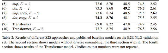 在本文中,我们展示了针对数据到文本问题的端到端模型的三个贡献。 我们调查了现有的S2S建模方法和扩展,以改进NLG问题中的内容选择模块。我们进一步表明,应用多样化的集成来模拟数据中不同的潜在生成样式可以为噪声数据带来更强大的学习过程。 最后,对所研究方法的实证评估表明,它们可以导致多个自动评估指标的改进。 在未来的工作中,我们的目标是扩展所显示的方法,以解决更复杂输入的生成问题,以及挑战数据到文档生成等领域。