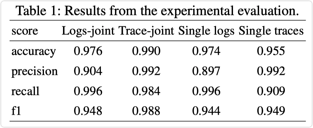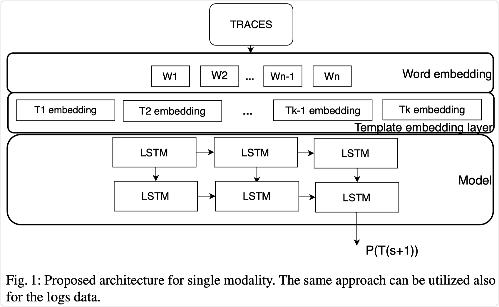 针对分布式系统服务的异常检测问题,文中提出了一种多模态的异常检测模型,联合了 trace 和 log 数据的特征表示来共同判定异常;对于异常检测任务将其形式化表示成 NTP next template prediction,同时适用于log和trace的异常检测;在实验中论文验证了融合多模态数据比单模态数据异常检测的效果更好。