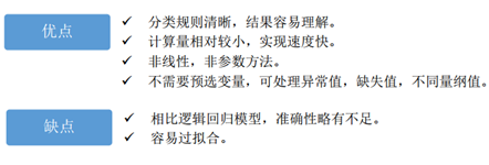 主要优缺点如下图。缺点补充几点,不是很稳点,数据变化一点,你的树就会发生变化;没有考虑变量之间相关性,每次筛选都只考虑一个变量(因此不需要归一化);只能线性分割数据;贪婪算法(可能找不到最好的树)。优点也补充三点,同时可以处理分类变量和数值变量(但是可能决策树对连续变量的划分并不合理,所以可以提前先离散化);可以处理多输出问题;另外决策树不需要做变量筛选,它会自动筛选;适合处理高维度数据。