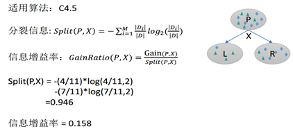 C4.5算法:使用信息增益率作为分裂规则(需要用信息增益除以,该属性本身的熵),此方法避免了ID3算法中的归纳偏置问题,因为ID3算法会偏向于选择类别较多的属性(形成分支较多会导致信息增益大)。多分叉树。连续属性的分裂只能二分裂,离散属性的分裂可以多分裂,比较分裂前后信息增益率,选取信息增益率最大的。