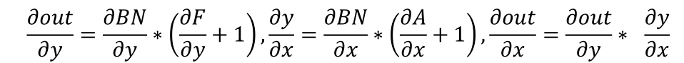 其中BN表示归一化函数,A表示注意力操作,F对应的是前馈层的线性变换,求导后得到: