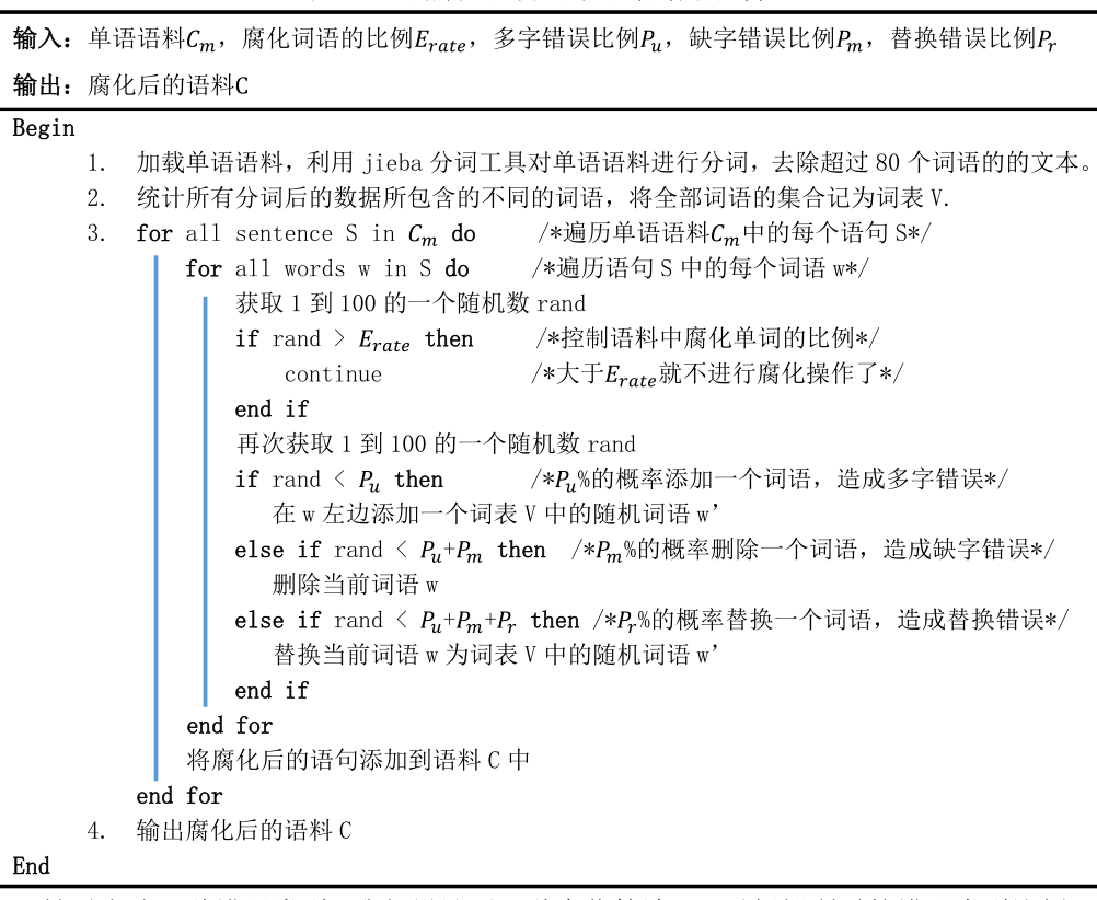 互联网中存在着大量的中文单语数据,即完全正确的中文语句。在这些容易获取且完全正确的单语语料中,合理地添加错误,即可得到大量的语法纠错并行语料。因此,我们认为可以将人们常犯的错误按照添加删除替换的规则简单区分为,多字错误,缺字错误以及替换错误。我们设计了一种腐化算法,可以根据所需的错误类型比例,对单语语料进行造错,具体实现如下: