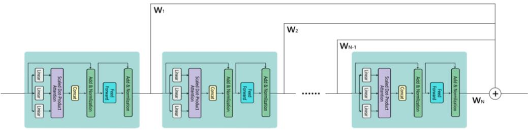 受到 ELMo工作启发,我们认为在不同的神经模块中学习到的知识可能有互补的作用,即高层的神经模块的状态可以捕捉到词语意义中和语境相关的特征,而低层的可以找到语法方面的特征,将所有模块的输出动态地结合到一起,可以表达更加丰富的语义信息。具体计算如下: