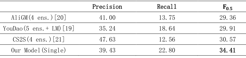 同时,我们与NLPCC2018中文语法纠错共享任务的前三名团队进行了结果的比较。'4 ens.'表示 4 个模型集成的结果,'LM'表示利用了额外的语言模型。从中可以看到,我们模型的F值优于所有队伍的表现,而且该结果是我们仅使用单一模型得到的,没有任何模型的集成和语言模型的使用。