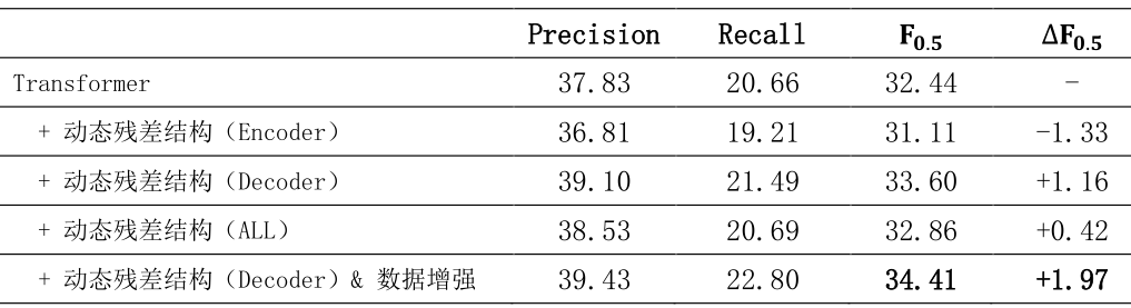我们分别做了5组实验,来验证本文所提出的方法的有效性,实验结果如下所示。动态残差组的第三第四组实验相对于第一组结果都有明显的提升,但第二组的F值略有降低,对比这三组的结果,我们发现在解码器端添加动态残差结构可以很好地提升模型的表现,但是在编码器端却会损害模型的纠错能力。这也就说明了第四组实验中,F值的提升主要贡献都来自于解码器端而非编码器端。第五组实验是在第三组实验上又加入了数据增强的方法,使得模型的性能达到了最优。