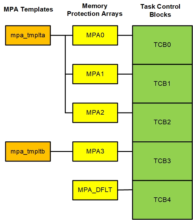 图 1 显示了任务控制块 (TCB)、内存保护阵列 (MPA)和MPA 模板之间的关系。