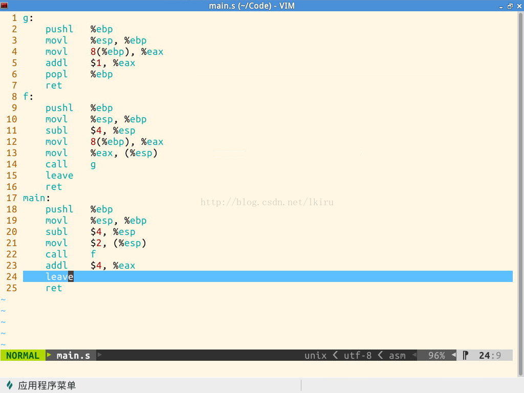 15.leave指令作用为将esp设置为ebp,然后pop ebp。在这条指令执行前,ebp存放的是f函数的栈底,通过9,10 行汇编代码我们看到,f函数的ebp指向的内存单元存放的是main的ebp,所以leave指令做的事情其实是将ebp设置成main的ebp。那么为什么g函数返回前没有leave指令呢?这时因为g函数返回前esp就是ebp,所以不需要将esp设置成ebp的过程,可以直接pop ebp。