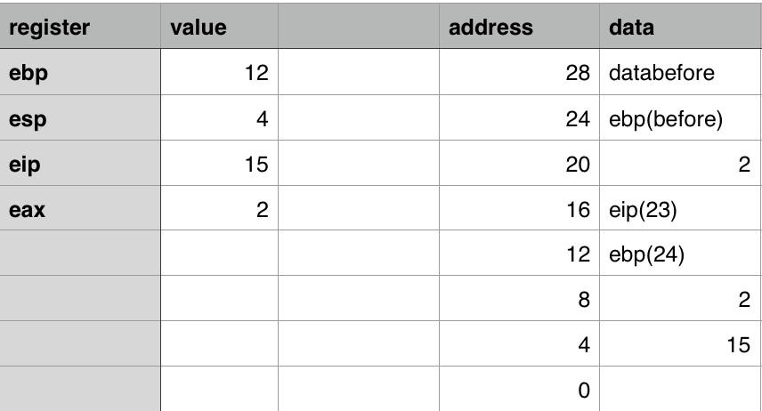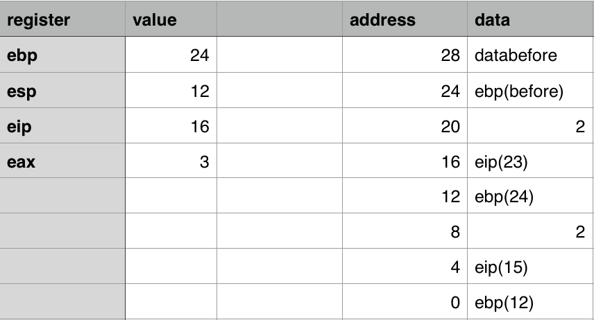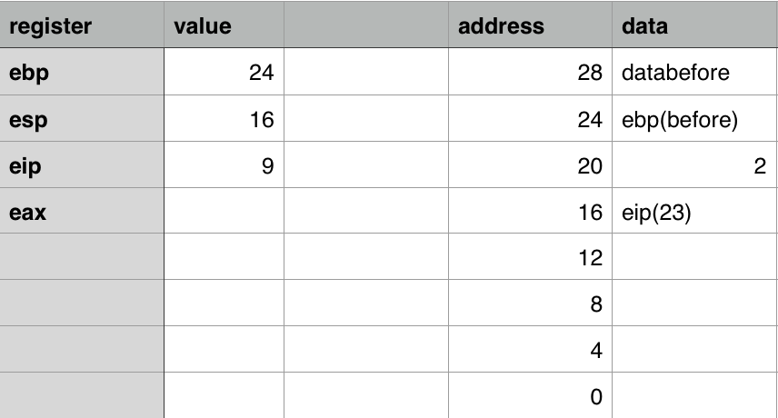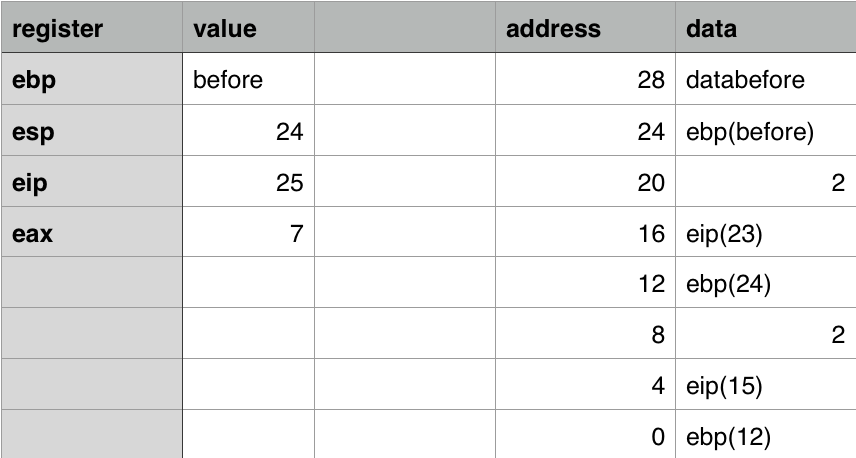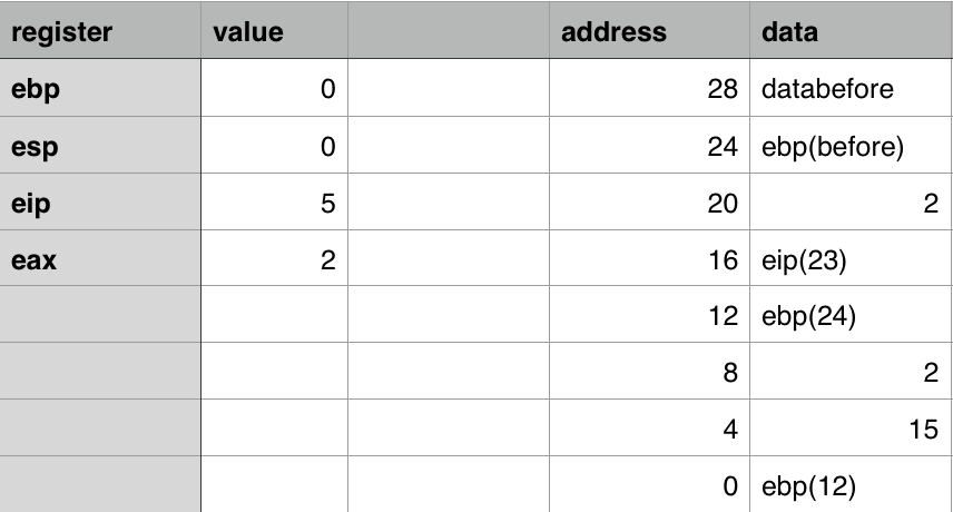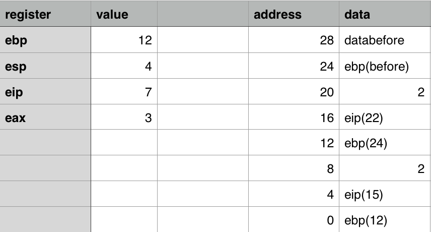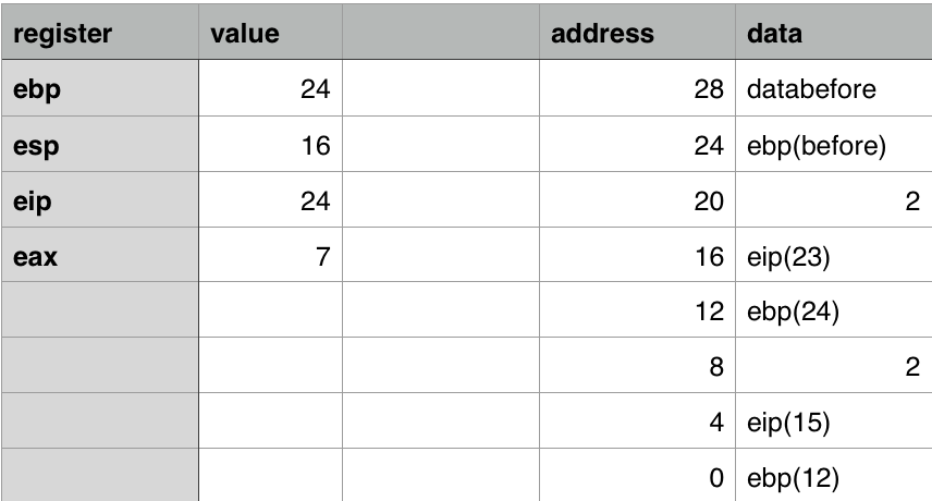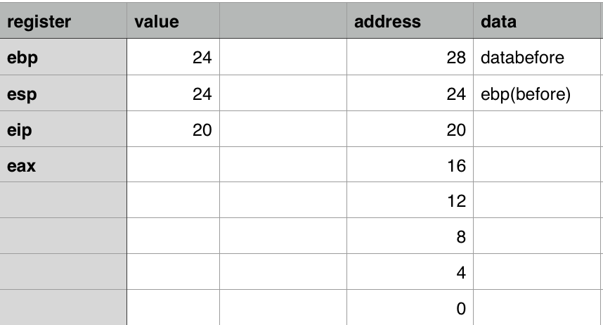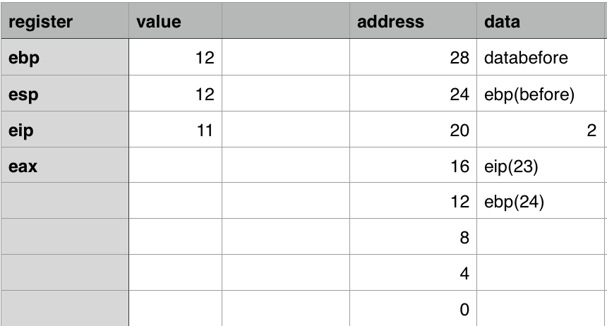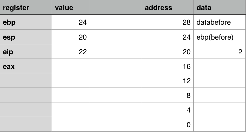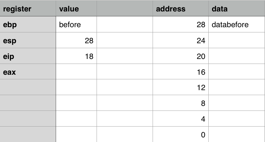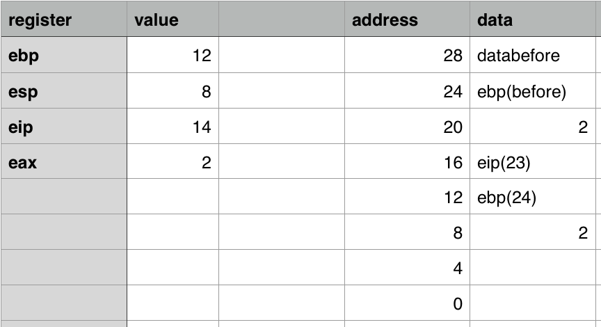 假设这是代码运行前ebp,esp,eip,eax的状态,以及栈的内容。