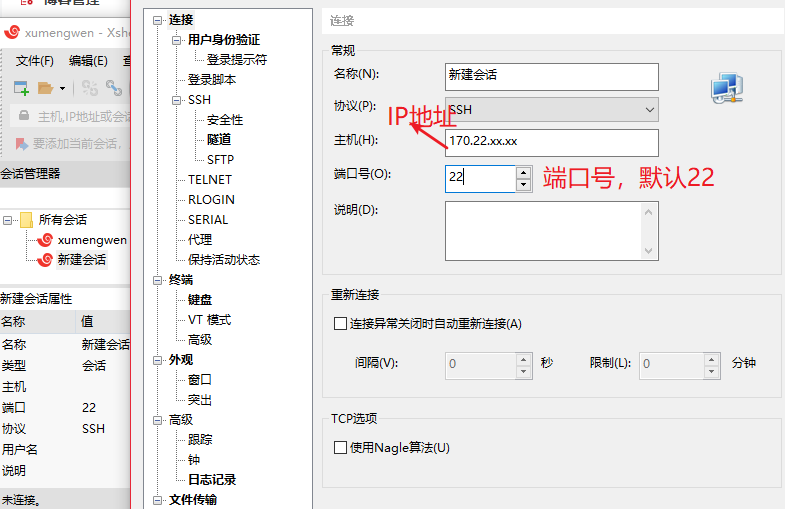 Xshell-->文件-->新建会话,按照实际情况填写,之后输入用户名和密码,就可以操作服务器了。