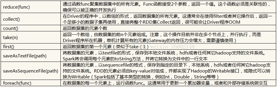 执行操作(Action) (如:count,collect,save,reduce等),执行操作会返回结果或把RDD数据写到存储系统中。Actions是触发Spark启动计算的动因。