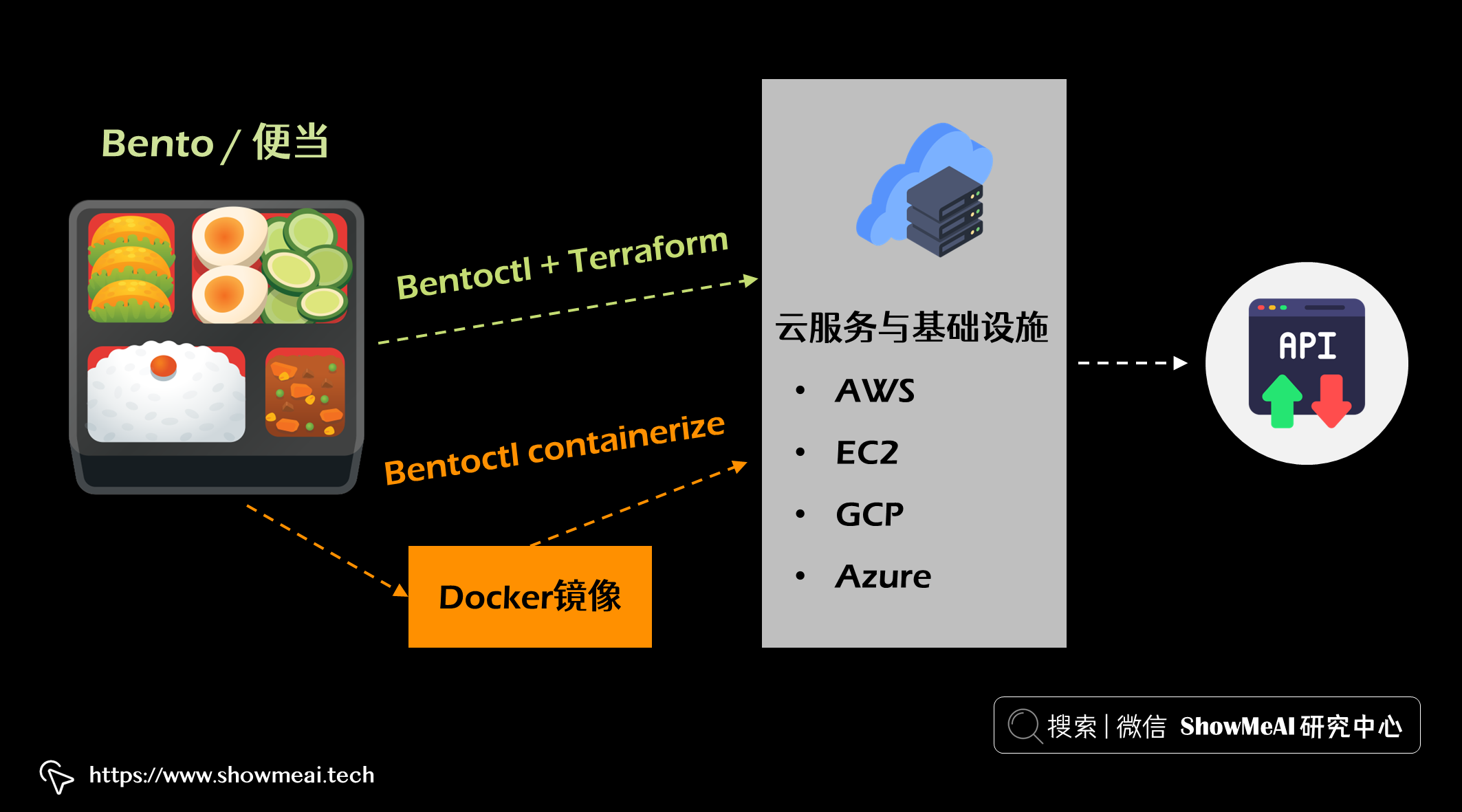 当 bento 构建完成后(下文会详细说明),你可以将它变成一个可以部署在云上的 Docker 镜像,或者使用 bentoctl(它依赖 Terraform) 将 bento 部署到任何云服务和基础设施上(例如 AWS Lambda 或 EC2、GCP Cloud Run、Azure functions等)。