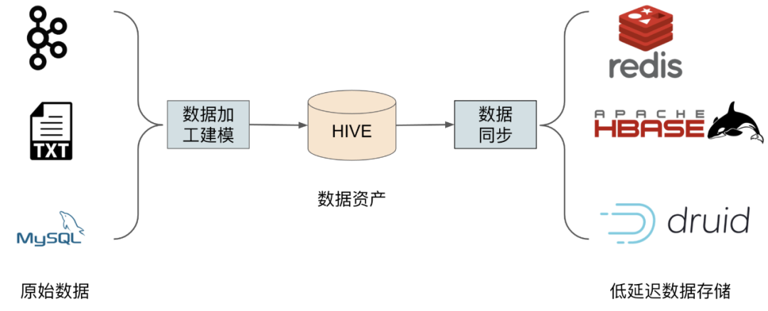 数据资产经由独立的数据同步服务,同步至其他更高速的存储引擎,如 Redis、Hbase、Druid 等。