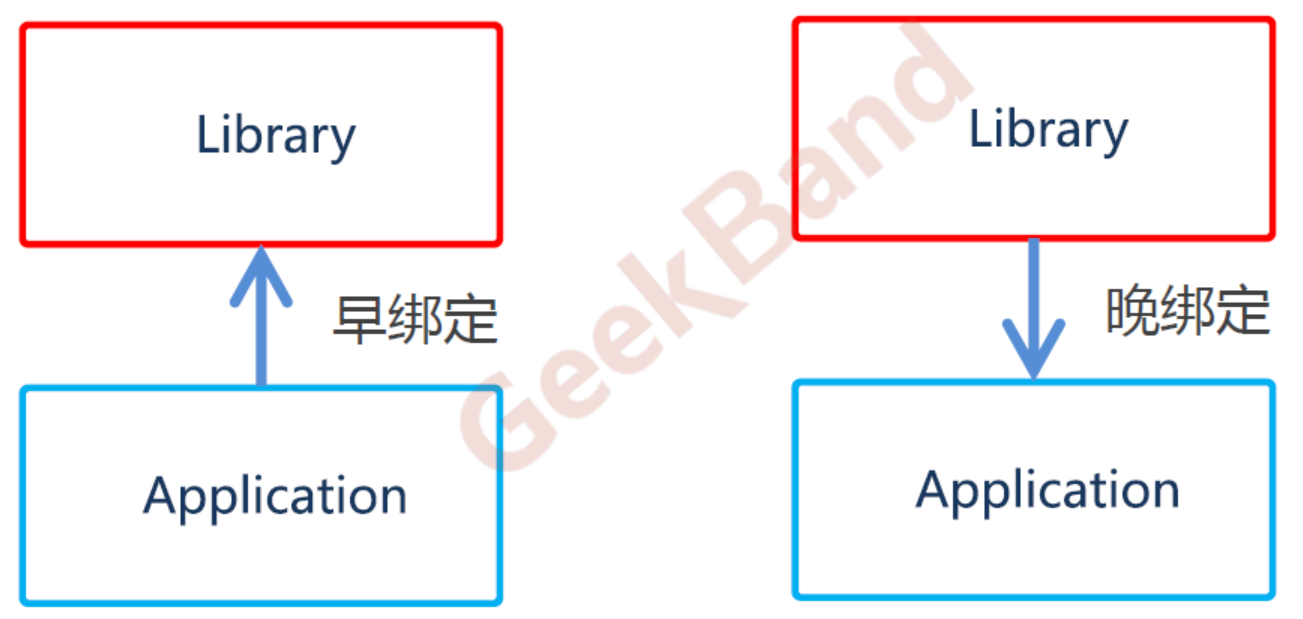 Library一般写地早,Application写地比较晚,当一个写地比较晚的东西调用一个写地比较早的东西,这就是早绑定。这是所有编程语言都比较默认的做法。在面向对象编程里面有一种叫做晚绑定的机制,Library调用Application, 一个早的东西调用一个晚的东西,这就叫做晚绑定。