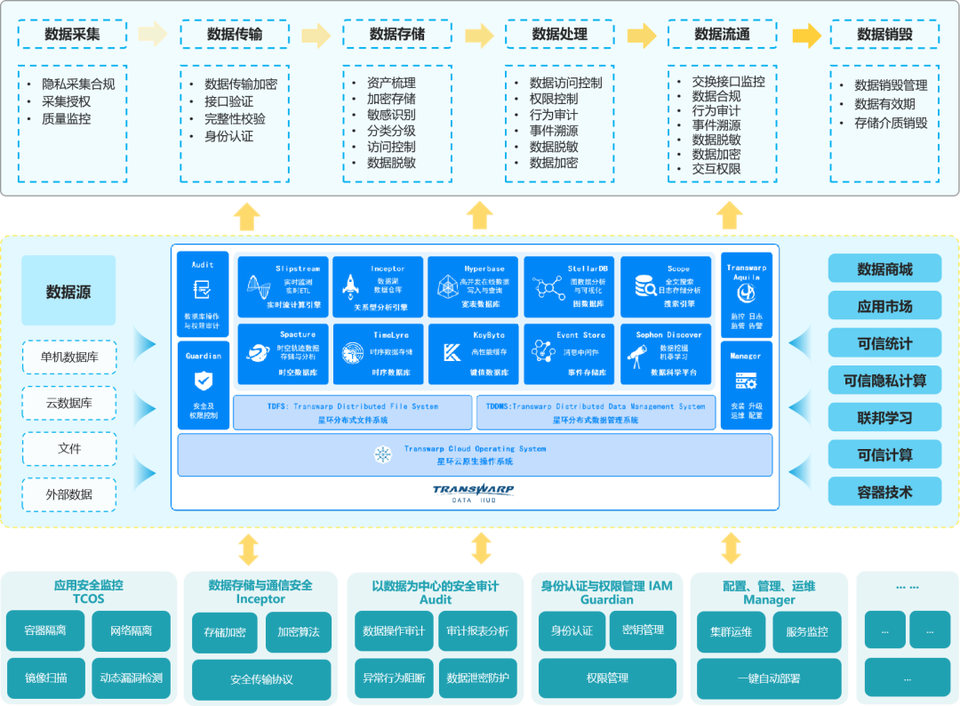 TCOS是星环科技推出的一款结合大数据技术与容器技术的云原生操作系统,通过零信任技术构建安全基础能力来实现隐私计算安全区,支撑大数据服务进行联邦学习与可信计算时对计算安全、数据安全、网络安全的需求。基于TCOS容器层的身份认证与权限管控机制,星环科技大数据基础平台TDH采用kubernetes Overlay网络技术实现了网络层面的管控,保证了集群内部网络和外部网络安全可控的访问权限控制,该模型不仅降低了用户使用网络进行访问控制的难度,还提高了数据中心网络的可用性、安全性和可靠性。为了有效扼制安全隐患以及数据泄露风险,TDH在数据生命周期的各个阶段进行全链路敏感数据动态感知与防护,包括备份和恢复方案,数据清理方案,数据销毁工作流程,介质的使用、转储、送修、销毁及对存储环境进行分级管理,全方位地实现数据安全管理的标准化、智能化。通过TDH统一的数据访问接口,用户无需再考虑底层数据库、平台的SQL语法、存储位置和拓扑,极大地提升产品易用性。