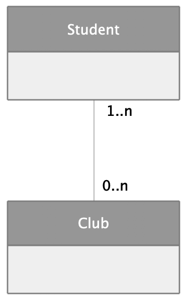 依旧拿大学生和社团举例,一个大学生可以参加好几个社团,一个社团也可以有很多大学生,这就是多对多关联的例子。UML 图如下: