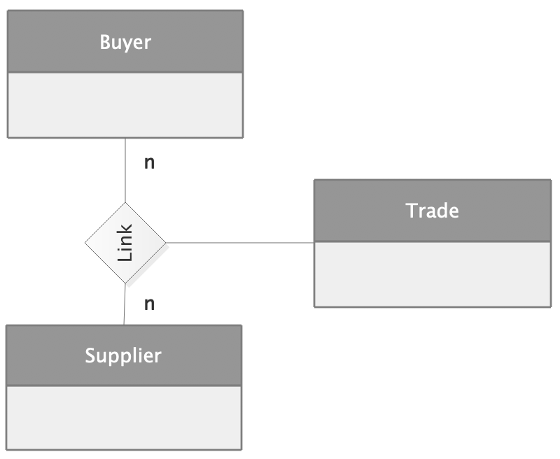 拿交易来举例,交易需要买家与卖家,但必须有了交易这个事情本身,买家与卖家的关系才能成立,这就是二元关联的例子。同理三元、四元关联也一样。UML 图如下:
