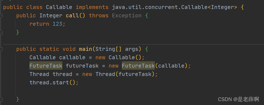 创建一个类进行实现Callable接口,覆写call方法,把新建的类callable类放到新建的FutureTask类里面,再把callable放到新建的Thread类里面在进行start进行启动