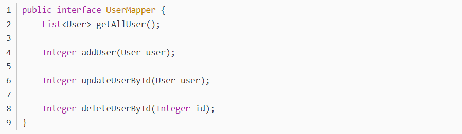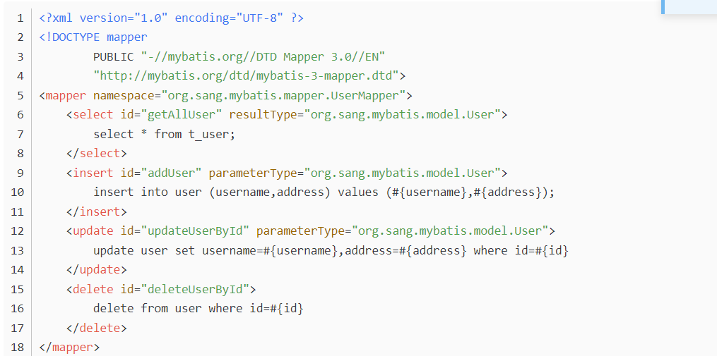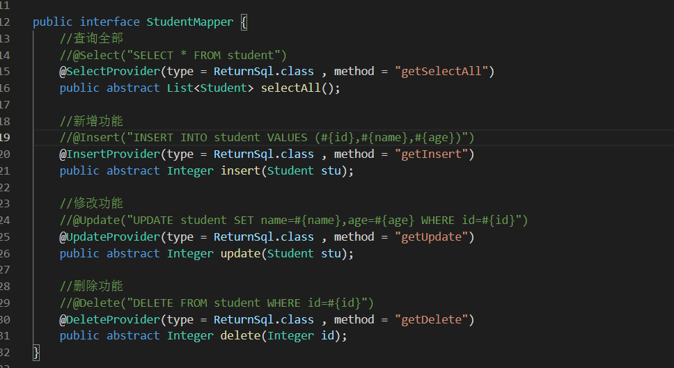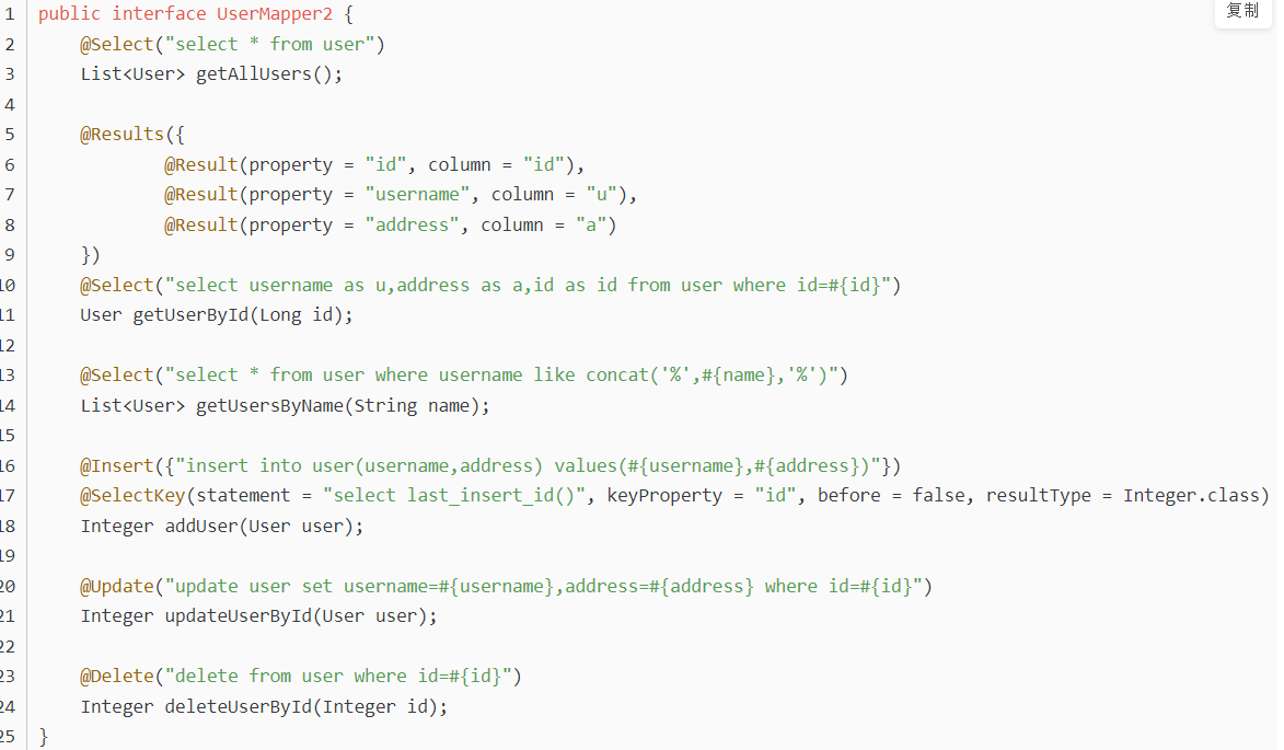 注:@Select、@Insert、@Update以及@Delete四个注解分别对应XML中的select、insert、update以及delete标签,@Results注解类似于XML中的ResultMap映射文件(getUserById方法给查询结果的字段取别名主要是向小伙伴们演示下@Results注解的用法),另外使用@SelectKey注解可以实现主键回填的功能,即当数据插入成功后,插入成功的数据id会赋值到user对象的id属性上