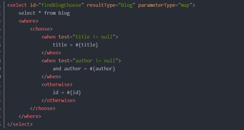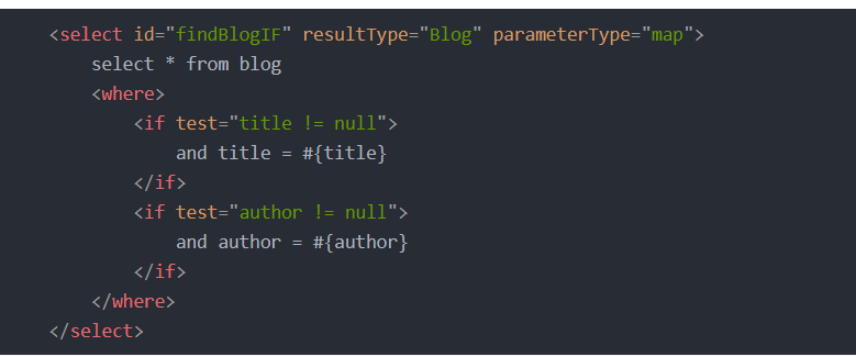 解释:当map为空时where中执行select * from blog where id=#{id},当满足title不为null时,就拼接 select * from blog where title=#{title},当满足author不为null时,就拼接 select * from blog where author=#{author}
