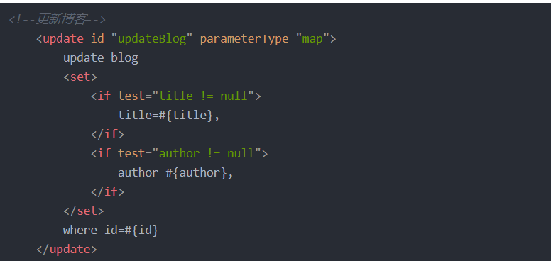 解释:当map为null时,就相当于update blog where id=#{id},如果title和author都有值就相当于 update blog set title=#{title},author=#{author} where id=#{id}