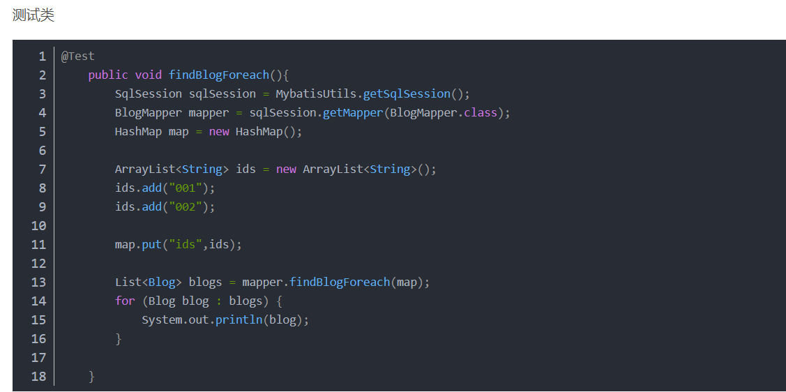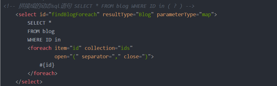 解释:该xml相当于select * from blog where id in(?,?,...)