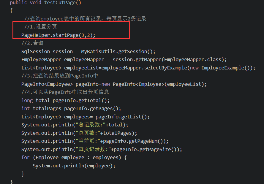 3.在查询语句执行之前,执行下面代码:PageHelper.startPage(当前页码,每页条数);