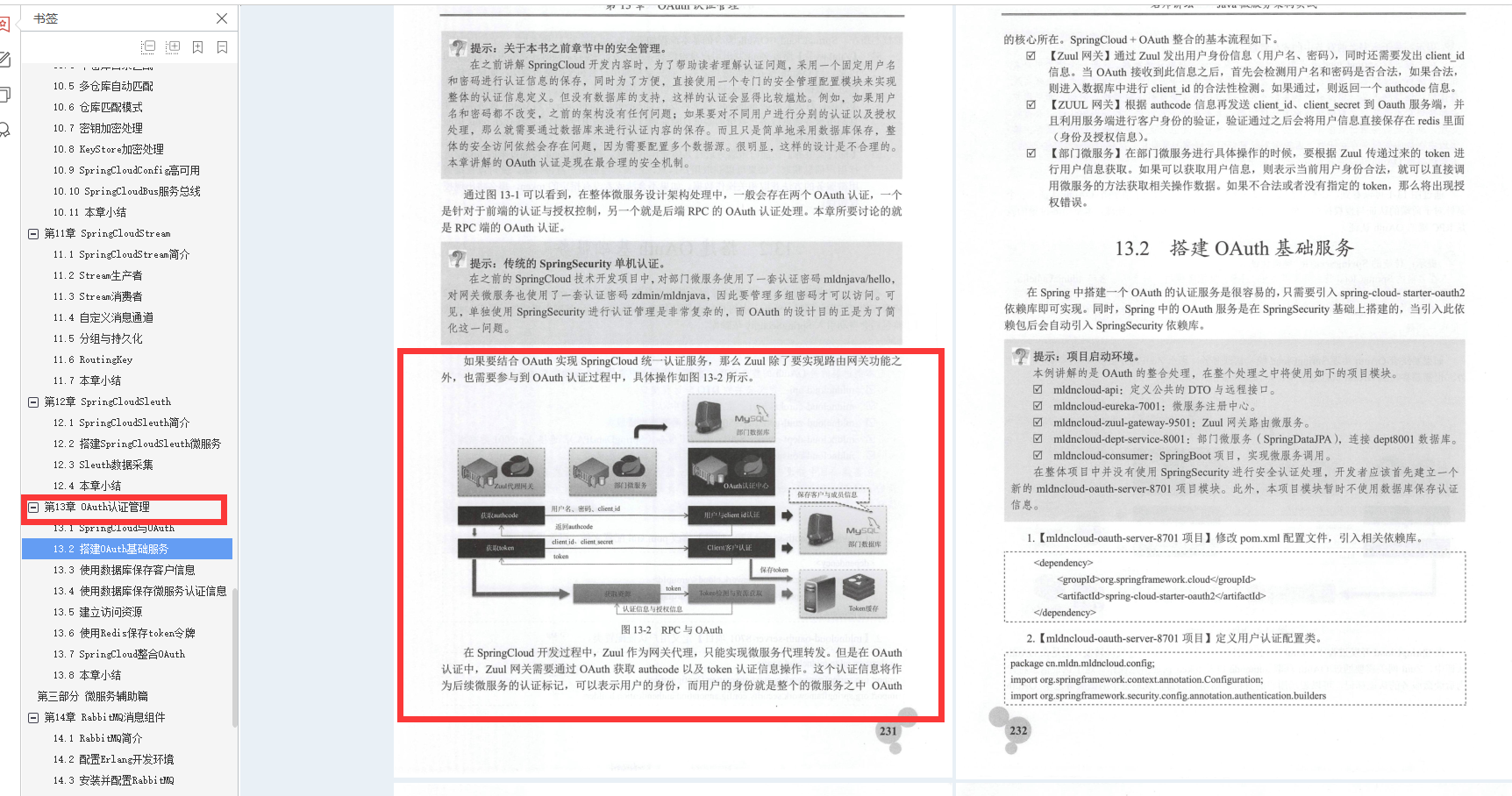 **第13章OAuth认证管理:**分析SpringSecurity实现方案缺陷、OAuth与RPC结合流程,并基于SQL数据库与Redis数据库实现OAuth认证与授权管理。