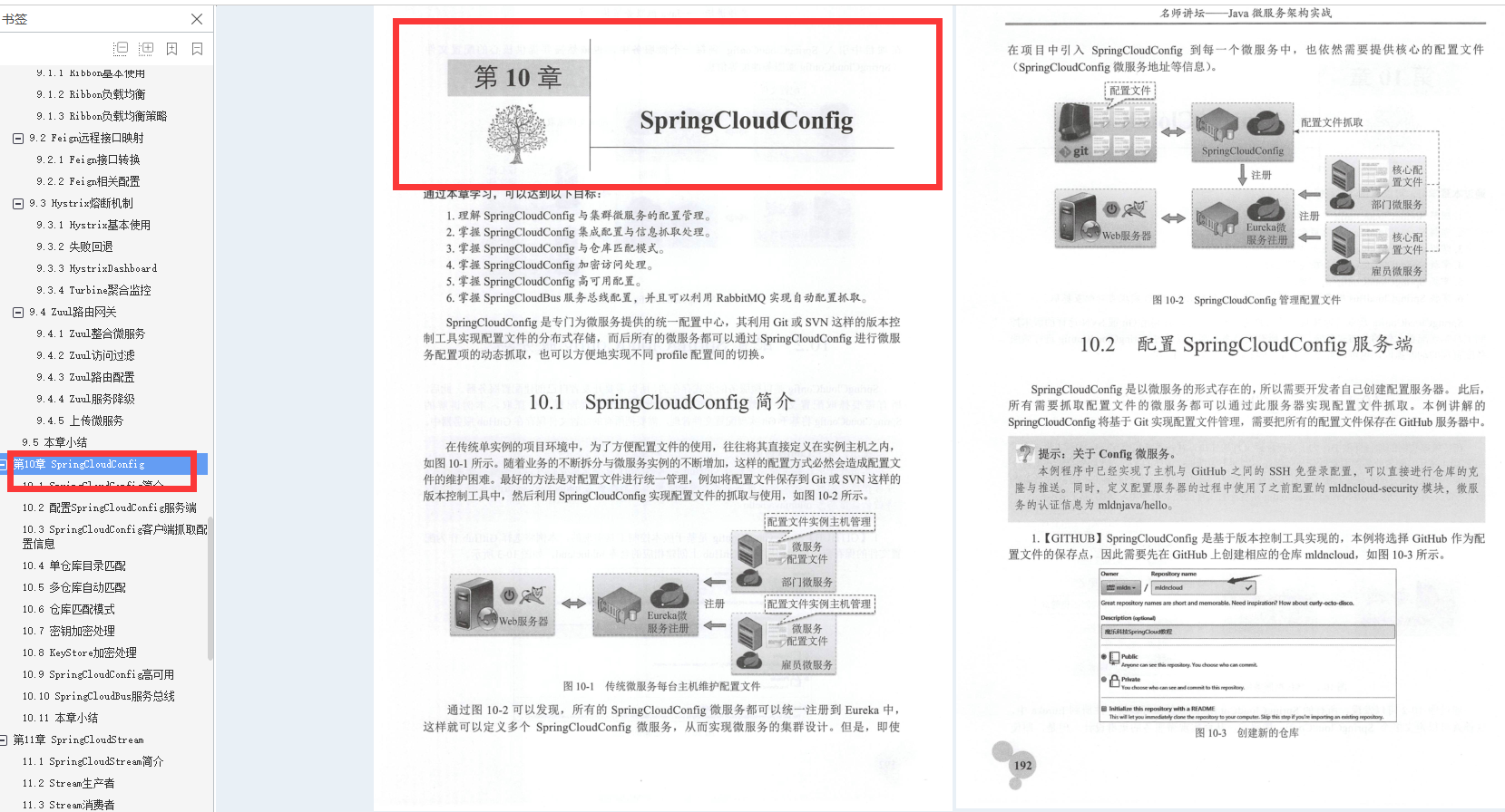 **第10章 SpringCloudConfig:**与GitHub结合实现分布式配置文件管理、加密处理、SpringCloudBus更新服务。