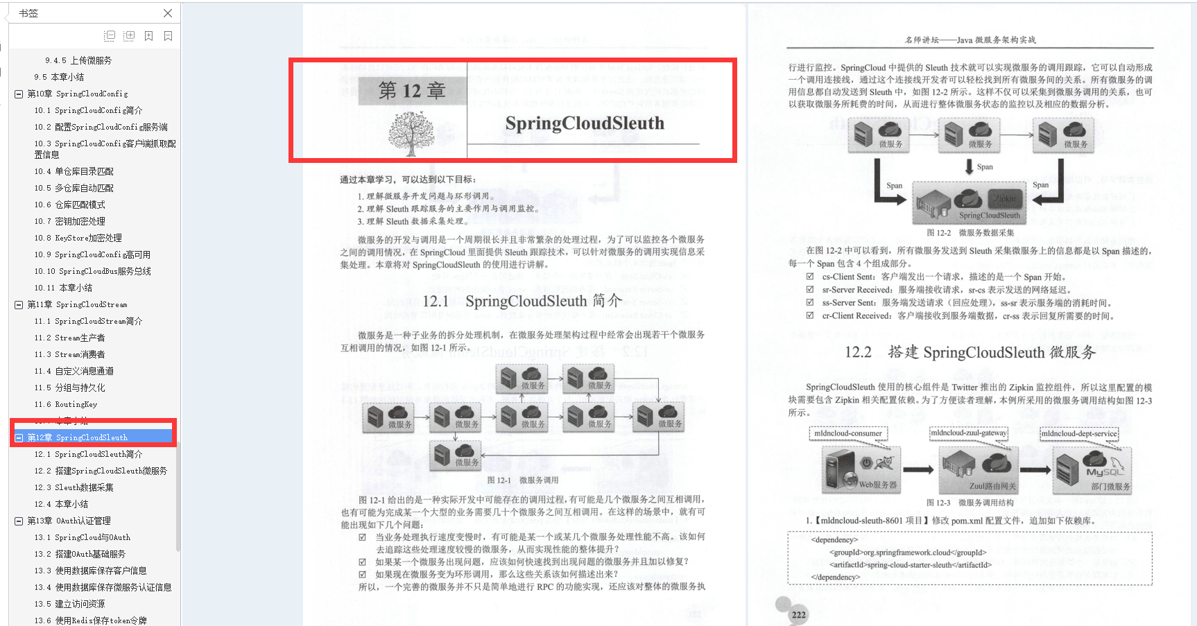 **第11章 SpringCloudStream:**讲解微服务中信息采集的搭建,主要与RabbitMQ整合。第12章SpringCloudSleuth:讲解微服务调用监控跟踪、Zipkin、数据采集。