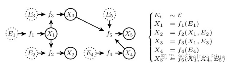 比如对于这一张因果图,箭头由因指向果,X和E都是变量。然后右边的一系列方程就是Structural Equations来描述这个图,每一个方程f都表示着由因到果的一个映射或者说一个表达式,这个方程可以是linear也可以是nonlinear的,取决于他们的因果关系是否线性。