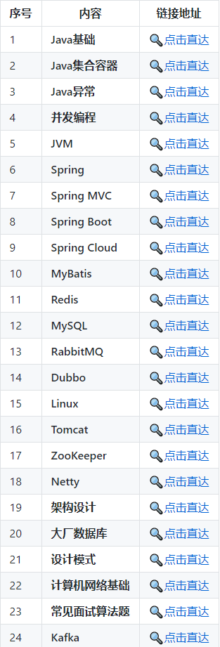 **【Java快速面试指南目录】**Java基础、异常、集合、并发编程、JVM、Spring全家桶、MyBatis、Redis、数据库、中间件MQ、Dubbo、Linux、Tomcat、ZooKeeper、Netty等等。包含了作为一个Java工程师在面试中需要用到或者可能用到的绝大部分知识!