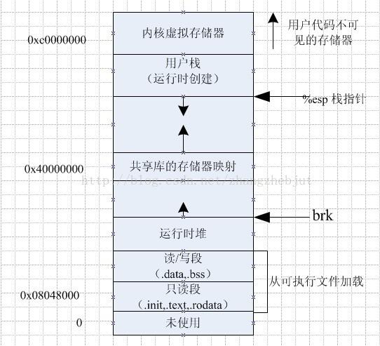 你还可以通过nm和objdump命令来察看二进制镜像,打印其中的符号,它们的地址,段等信息。最后需要指出的是,前文描述的虚拟地址布局在linux中是一种“灵活布局”,而且作为默认方式已经有些年头了,它假设我们有值RLIMT_STACK。但是,当没有该值得限制时,Linux退回到“经典布局”,如下图所示: