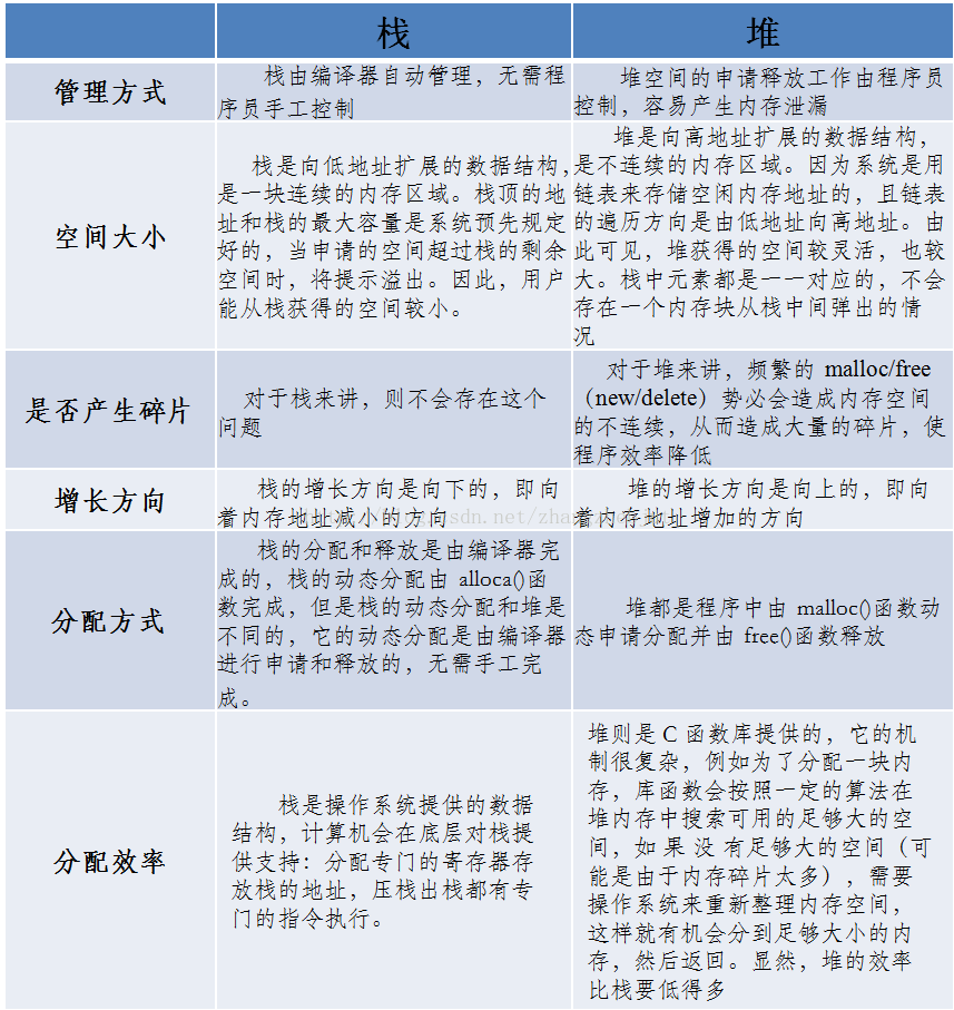 栈是反向增长的,地址递减;malloc等分配的内存空间在堆空间。堆是正向增长的,地址递增。