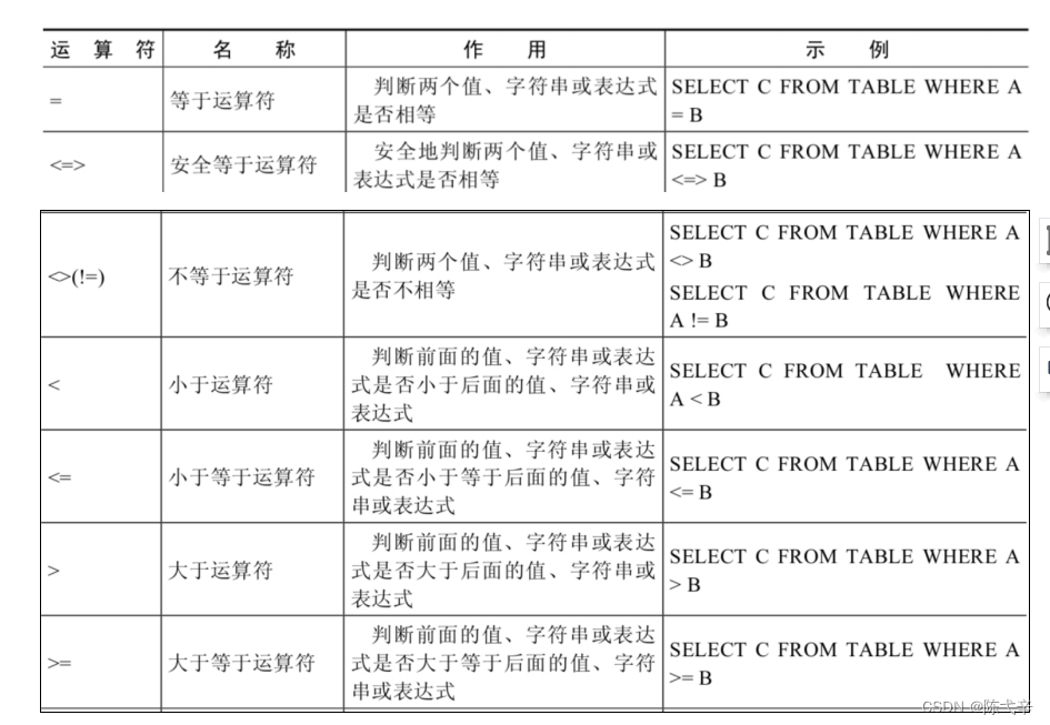 比较运算符用来对表达式左边的操作数和右边的操作数进行比较,比较的结果为真则返回1 ,比较的结果 为假则返回0,其他情况则返回NULL。比较运算符经常被用来作为SELECT查询语句的条件来使用,返回符合条件的结果记录。2.1 符号型比较运算符